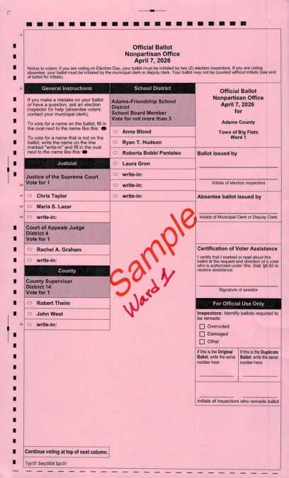 Town of Big Flats Town Hall, 1104 County Road C, Arkdale, WI 54613.